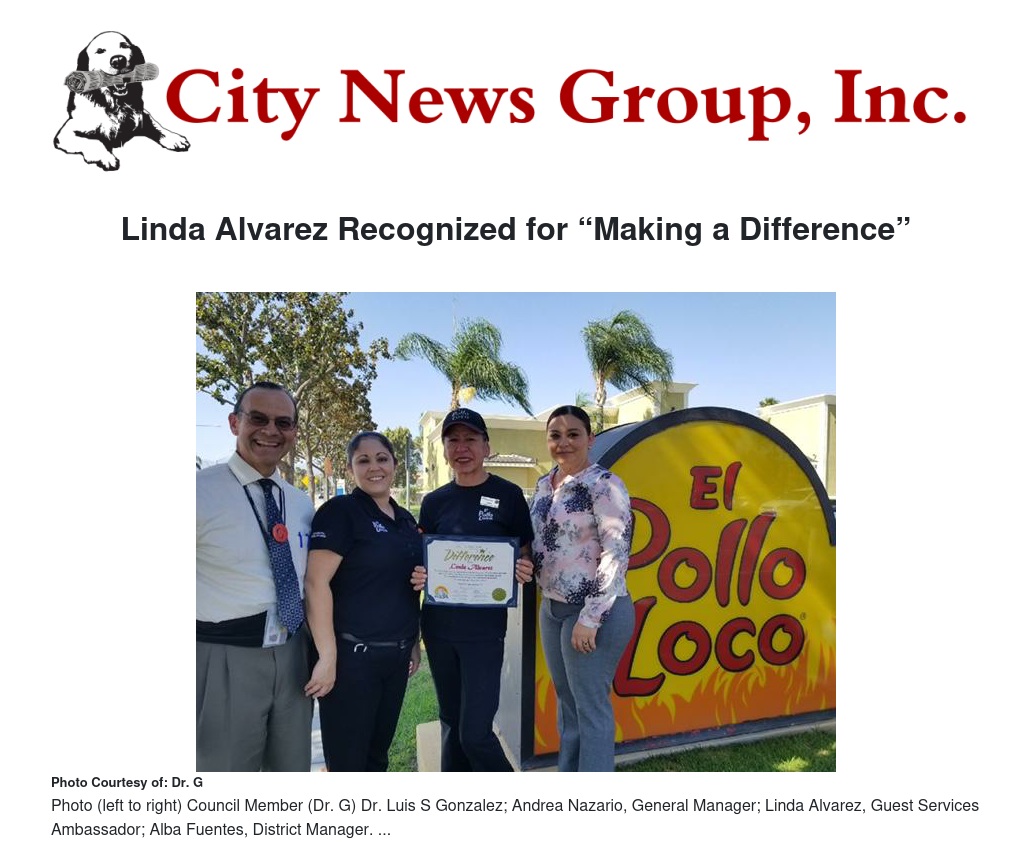 COLTON>> On Tuesday August 8, Council Member Dr. G (Dr. Luis S Gonzalez) made an on-site visit to El Pollo Loco restaurant to present Linda Alvarez a recognition certificate for the “You make a Difference” program.