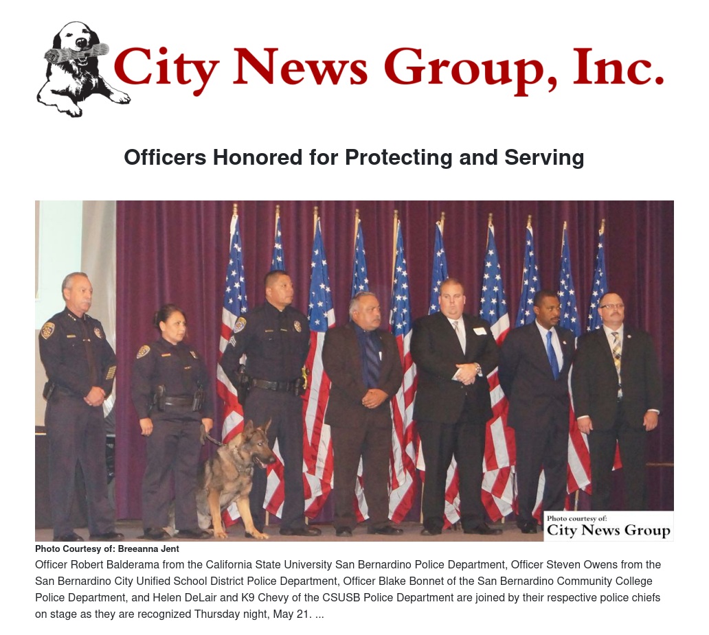 Officer Helen Delair of the CSUSB police department and her K9 Enjuan Von Der Chevron (a.k.a. Chevy) were also honored for their work in creating, implementing and piloting the K9 program on campus. Chevy is an explosive detection K9 who has assisted the university with bomb threats, suspicious packages and area sweeps and helps out surrounding agencies as well.