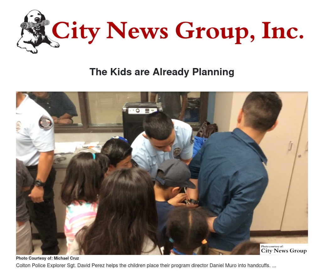 Colton Police Explorer Lt. Sam Saenz, and Explorer Sgt. David Perez spoke to the children about their mentorship program, and how they came to pursue their career choice. The children were excited when they proposed the kids could place the explorers in handcuffs.