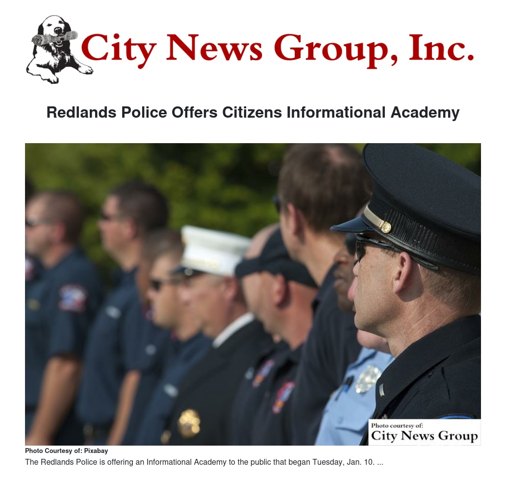 The press release states the graduates of the academy will be closely familiarized with the operations of the Redlands Police Department and will have gained a deeper understanding of the problems and policies facing the Redlands Police Officer.