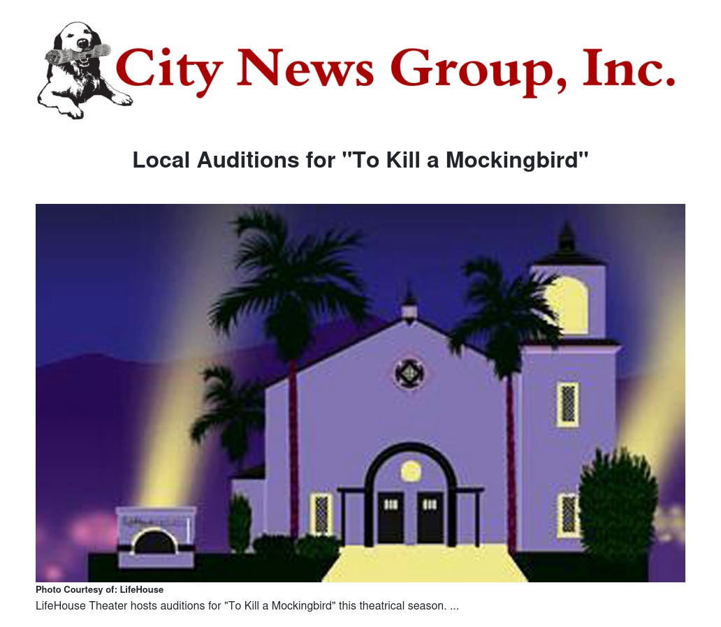 Open auditions for LifeHouse Theater’s production of Harper Lee’s “To Kill A Mockingbird,” dramatized by Christopher Sergel and directed by LifeHouse veteran Brady Huffman, will be Thursday, Dec. 18 from 6 to 9 p.m. at LifeHouse Theater located at 1135 N. Church Street, Redlands.