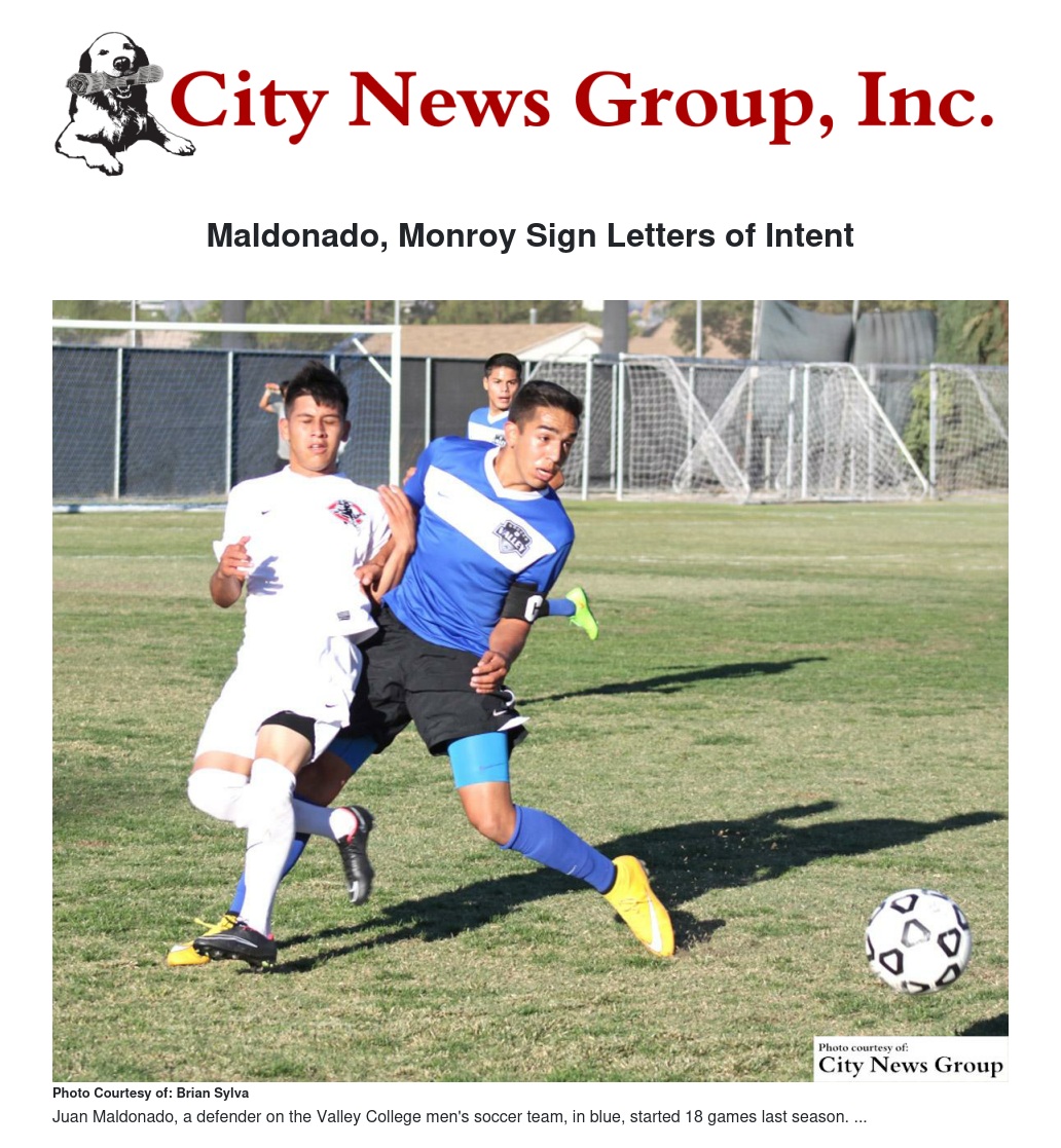 San Bernardino Valley College men’s soccer sophomore defender Juan Maldonado (Mammoth Lakes H.S.) and freshman midfielder Jonathan Monroy (Fontana A.B. Miller) have both signed letters of intent to play with Kansas Wesleyan University next season.