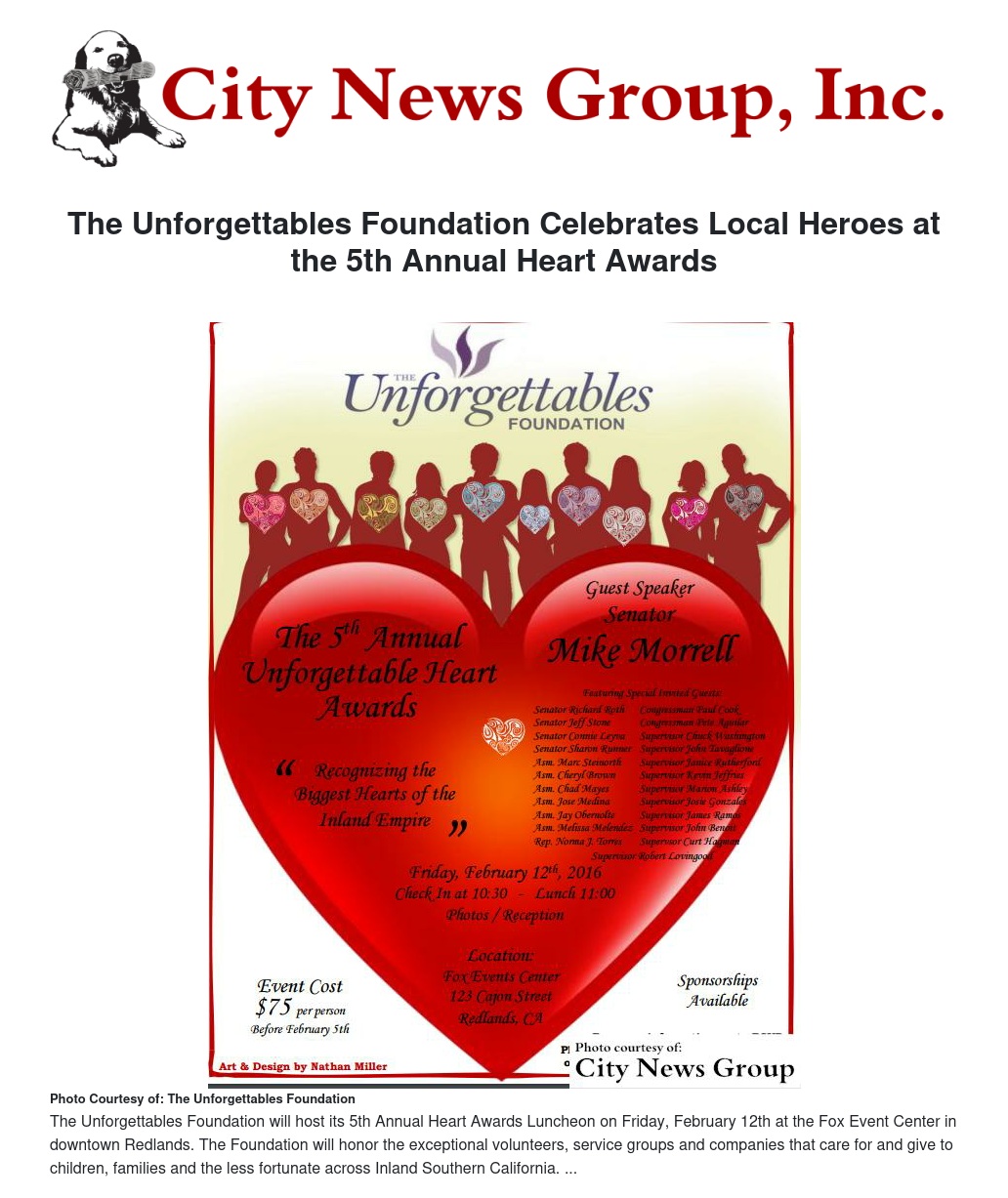 The Unforgettables Foundation will host its 5th Annual Heart Awards Luncheon on Friday, Feb. 12 at the Fox Event Center in downtown Redlands. The Foundation will honor the exceptional volunteers, service groups and companies that care for and give to children, families and the less fortunate through the Inland Empire.
