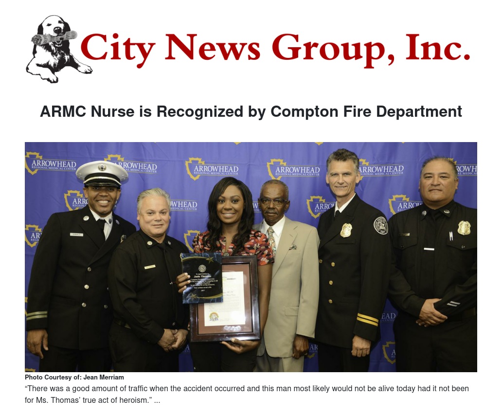 COLTON>> Arrowhead Regional Medical Center (ARMC) officials and Compton Fire Department personnel joined together at ARMC at 9 a.m. on Friday, Sept. 15, to honor a nurse, Jade Thomas. The Fire Captain presented a special plaque to Thomas for her selfless act in saving the life of an injured motorist.