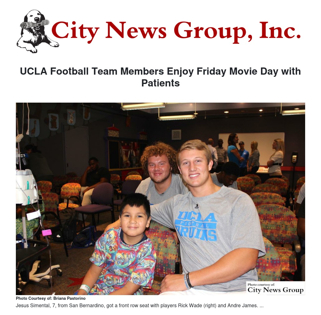 Members of the UCLA Bruins football team ventured out to Loma Linda University Children’s Hospital (LLUCH) Friday, July 24 to enjoy a movie day with patients.