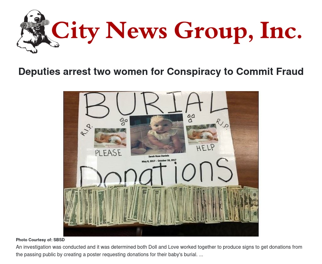 On Sunday, October 22, 2017 Chasity Doll was panhandling at the corner of Tippecanoe /Coulston in San Bernardino. Doll was arrested for the panhandling and booked. An hour later, Michele Love was found panhandling at the same location. During the booking of Love, evidence was found linking the two suspects together. An investigation was conducted, and it was determined both Doll and Love worked together to produce signs to get donations from the passing public by creating a poster requesting donations for their baby's burial. The baby shown does not belong to either of the suspects. This was done under false pretense, and there were no burial funds needed.