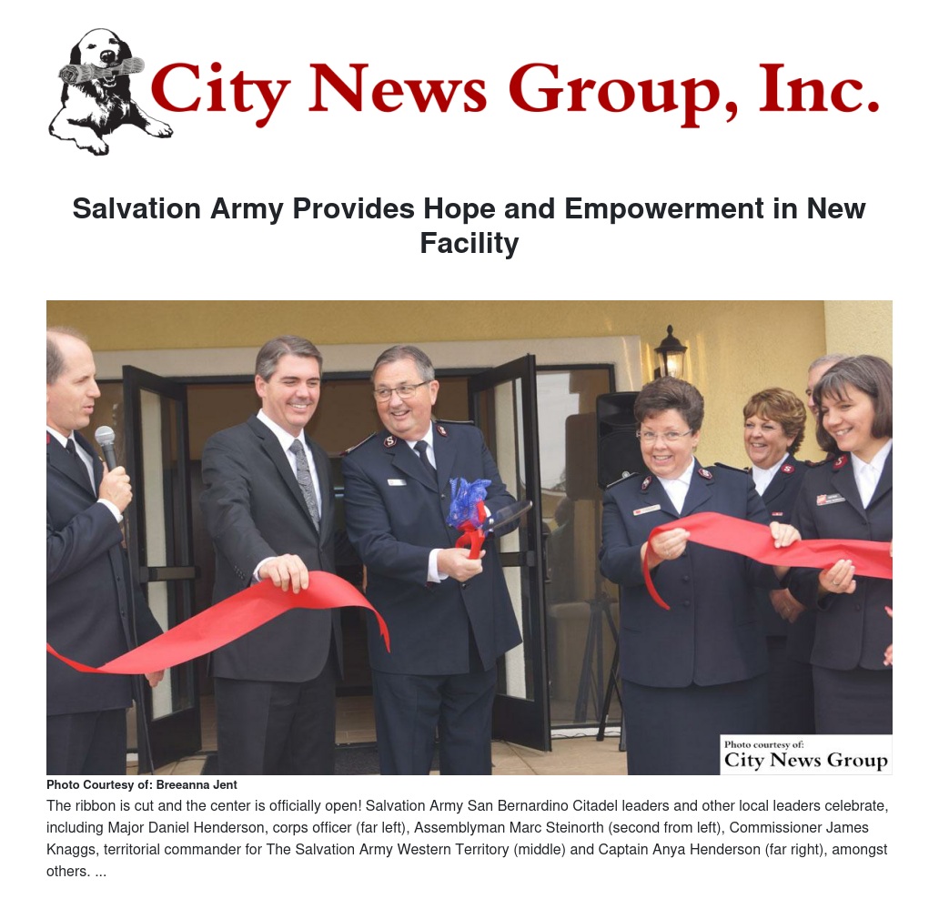 Tom Brickley, Chairman of the Salvation Army San Bernardino Corps Advisory Board, shared, “I especially want to thank Jack Katzman, Advisory Board Property Committee Chairman, and all the parties who came together to address and overcome all the design, construction, permitting and inspection process: the City of San Bernardino, Salvation Army property experts, contractor, architect, Major Dan Henderson and his staff. Without such a collaborative effort , this phenomenal facility would not be available to those most in need of it and all the lives it is going to impact for the better in the greater San Bernardino area.”