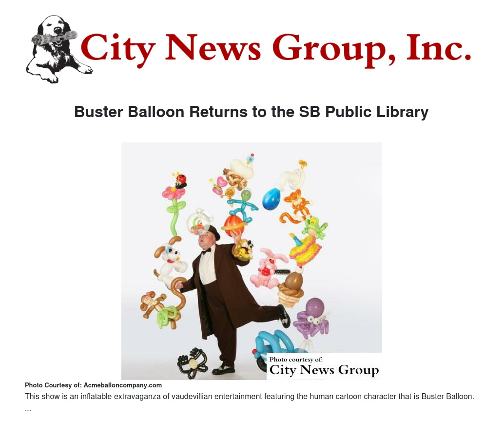 SAN BERNARDINO >> One of Southern California’s most popular children’s entertainers, Buster Balloon, will be performing his comedy balloon show live at the Feldheym Central Library. This free family performance will be held on Saturday, June 3, 2017 for the kick off celebration of the Summer Reading Game. It will be at 3:00 PM in the Bing Wong Auditorium at the Feldheym Library at 555 W. 6th Street.