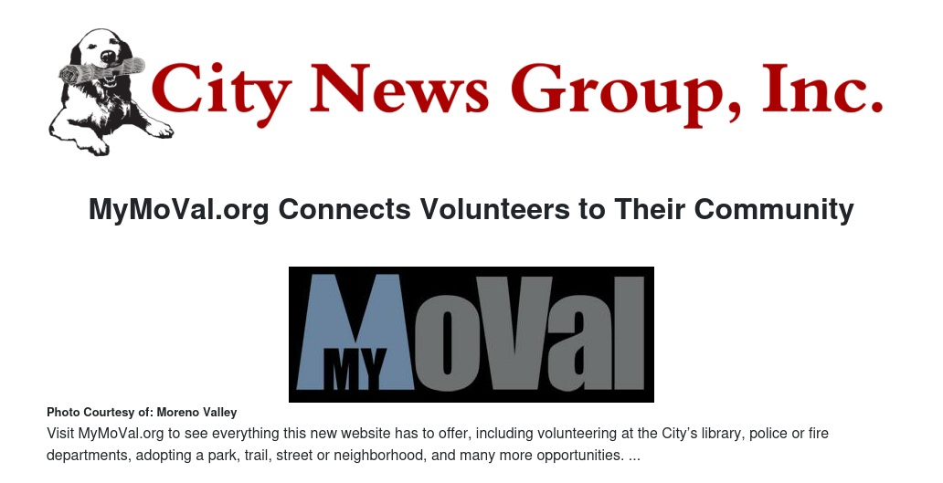 The City of Moreno Valley is pleased to announce the official launch of MyMoVal.org, an interactive website designed to connect residents with volunteer opportunities available throughout our City. Working together by sharing our time and talents, we can help improve the quality of life for all of our residents, business owners and visitors.