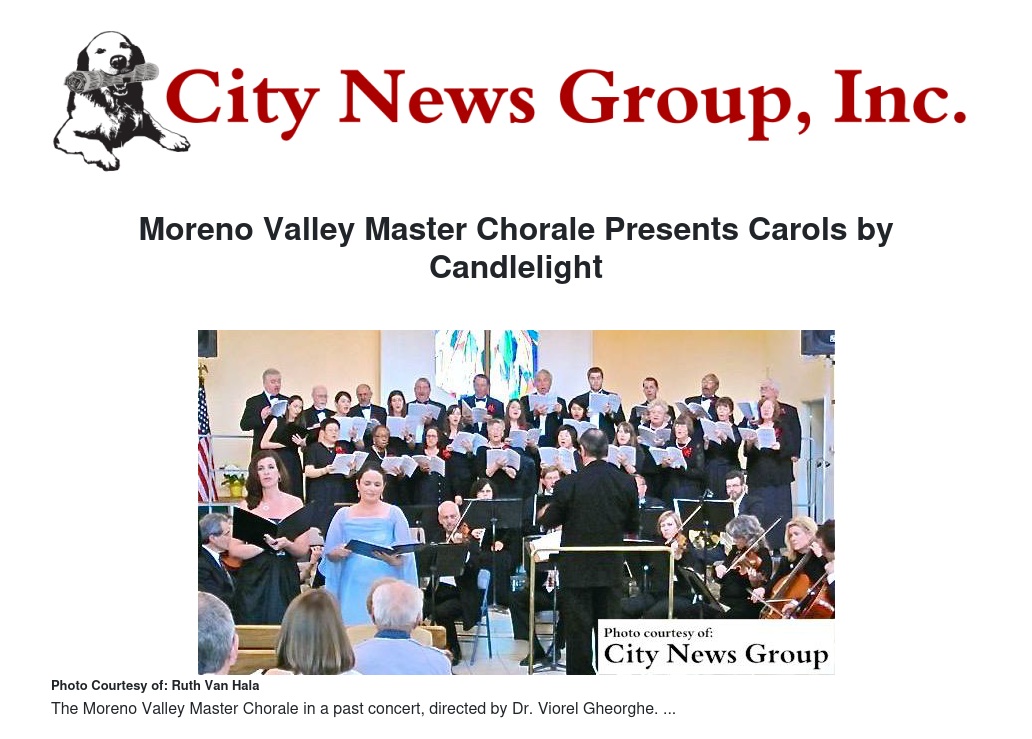 MORENO VALLEY>> On Sunday, Dec. 11 at 4 p.m., the Moreno Valley Master Chorale and Orchestra, under the direction of Dr. Viorel Gheorghe, will present a Carols by Candlelight concert at the Shepherd of the Valley Lutheran Church, located at 11650 Perris Blvd., north of Ironwood in Moreno Valley.