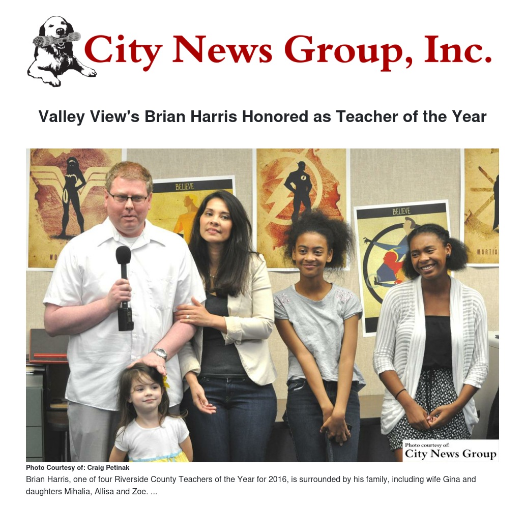 As an experienced high school teacher, Brian Harris was prepared for a few surprises on the last day of school. But he never expected to walk into his classroom at Valley View High School in the Moreno Valley Unified School District on Wednedsay, June 10, and be greeted by a host of dignitaries, cheering students, and his own four-year-old daughter Zoe running toward him with a golden crown.