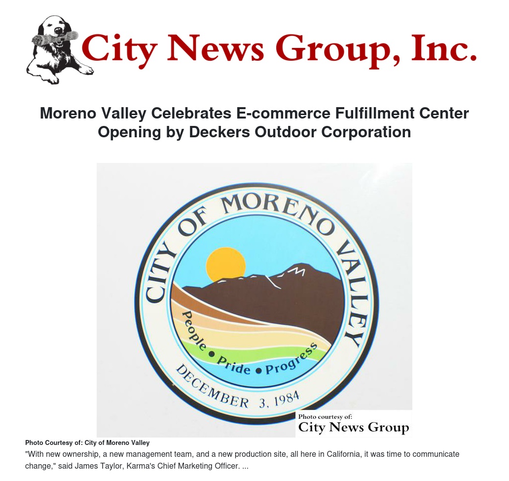 The City of Moreno Valley proudly announces the start of operations for Deckers Outdoor Corporation's primary North American e-commerce distribution center.
