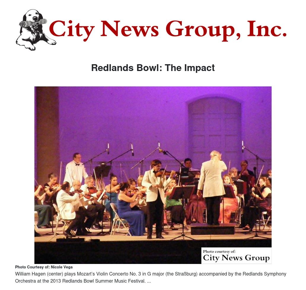 In 2013, the city of Redlands celebrated its 125th birthday and the Redlands Bowl its 90th anniversary. One of the performers that summer was William Hagen, who exemplified Mullen’s dream as a young violinist performing at the Redlands Bowl at the age of 20.
