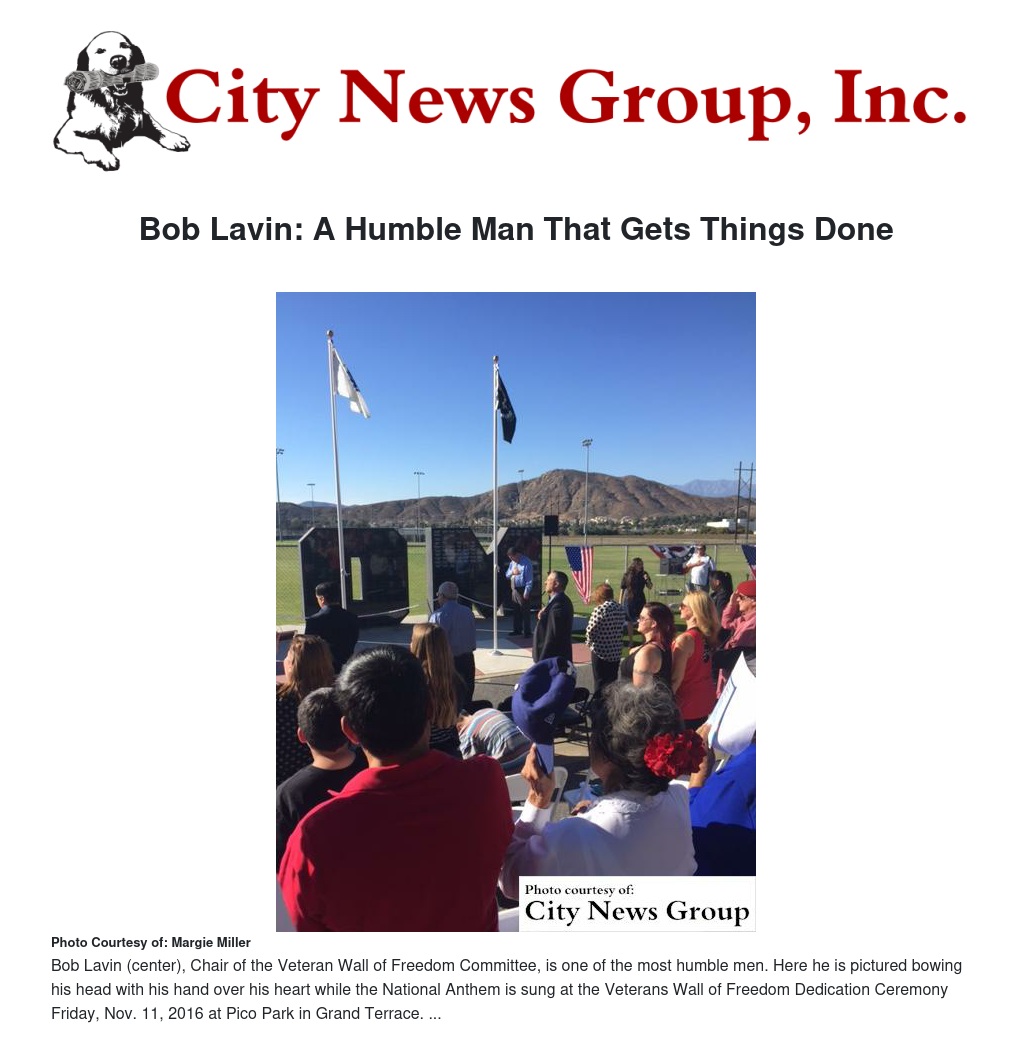 Lavin helped host the Veterans Wall of Freedom Dedication Ceremony at Pico Park in Grand Terrace Friday, Nov. 11 and also hosts other ceremonies for many veteran organizations.