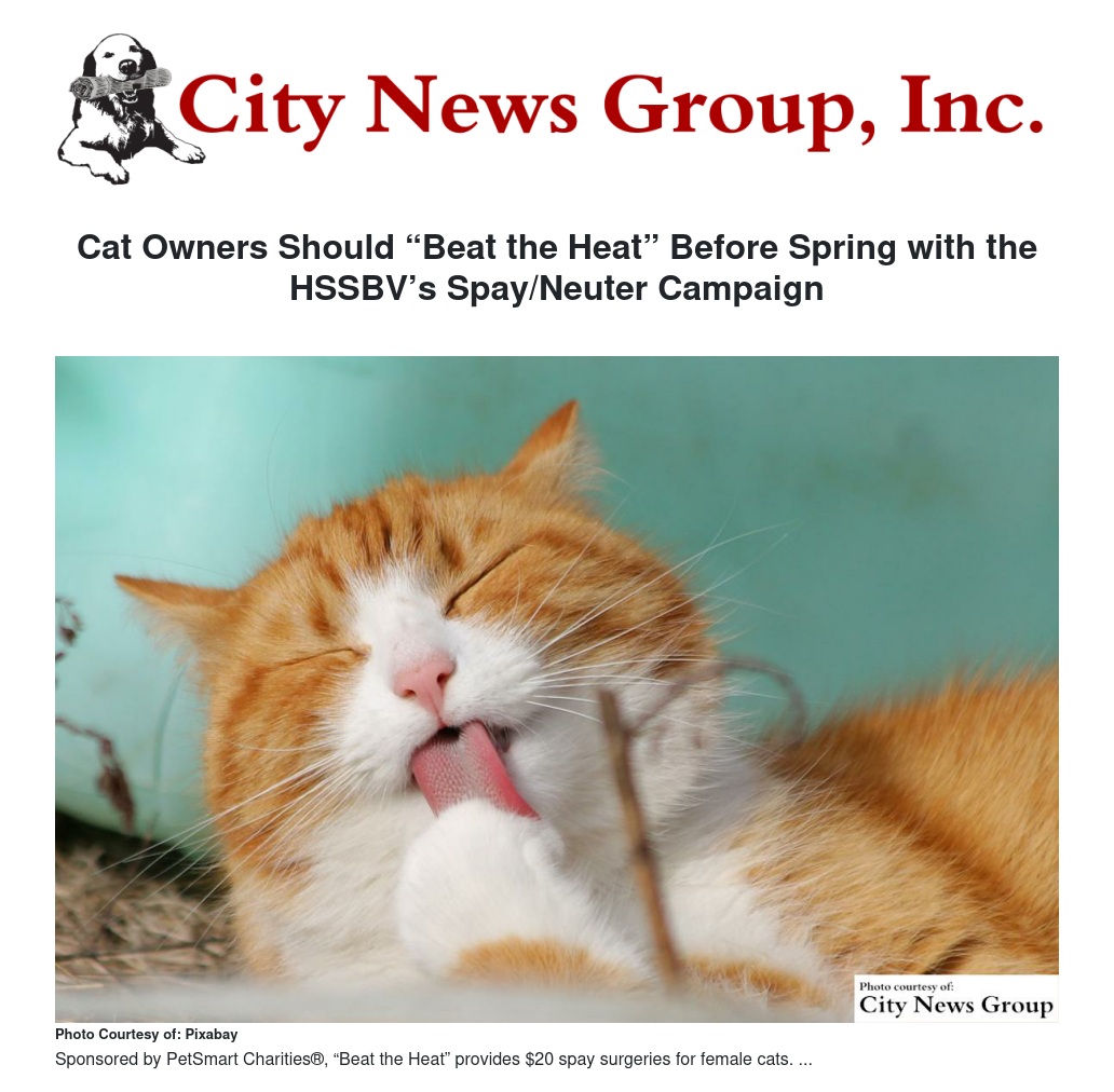 That’s why the HSSBV is offering a special “Beat the Heat” campaign sponsored by PetSmart Charities, the largest funder of animal welfare efforts in North America Through the “Beat the Heat” campaign, the HSSBV will provide $20 spay surgeries for female cats during the month of February while funding lasts.