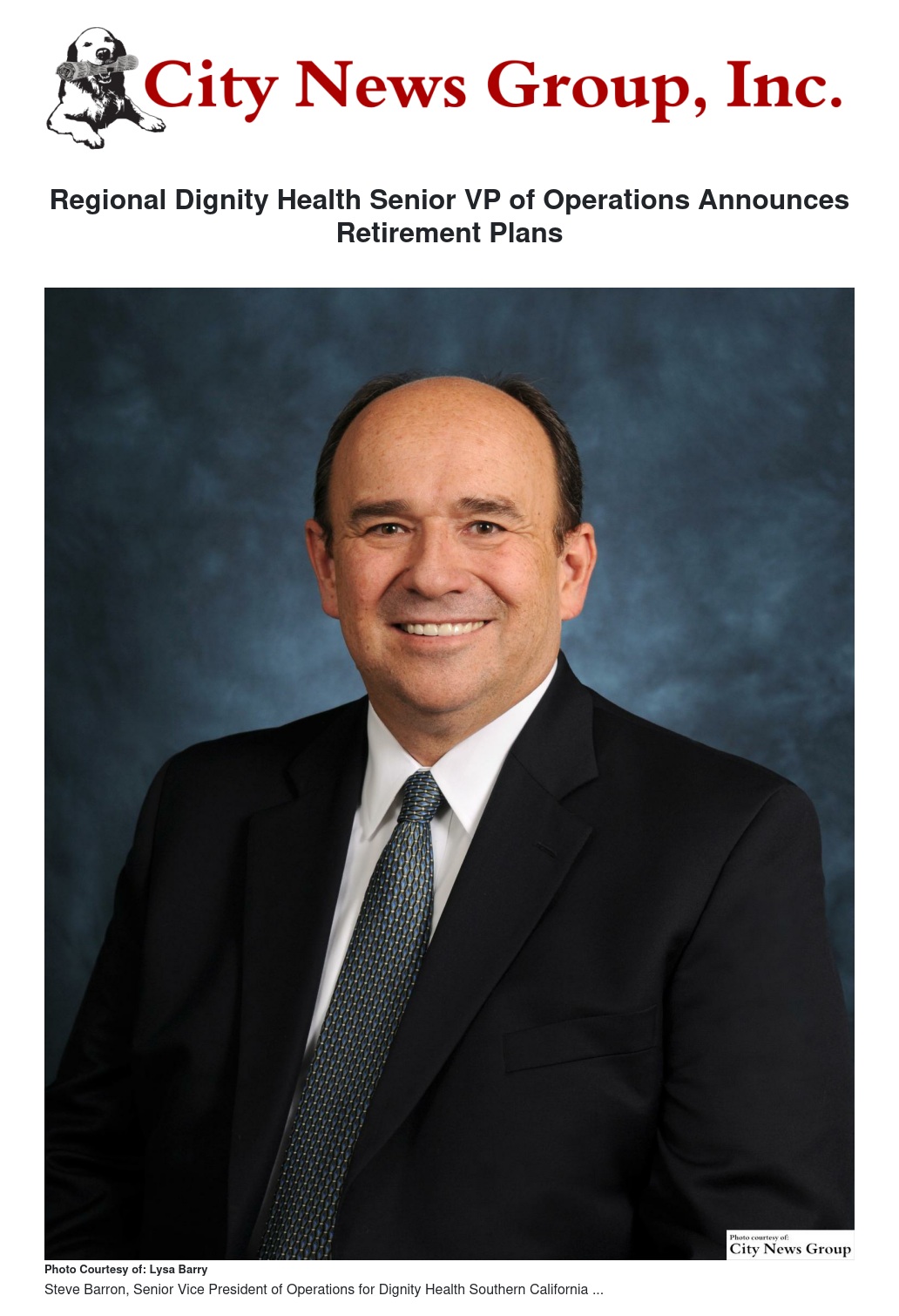 SAN BERNARDINO >> Steve Barron, Senior Vice President of Operations for Dignity Health’s Southern California Service Area, has announced his retirement after nearly 40 years in executive-level health care positions in Washington and California. While a search for Barron’s replacement has begun, he will remain in his current role and aid in the leadership transition through October 2016.