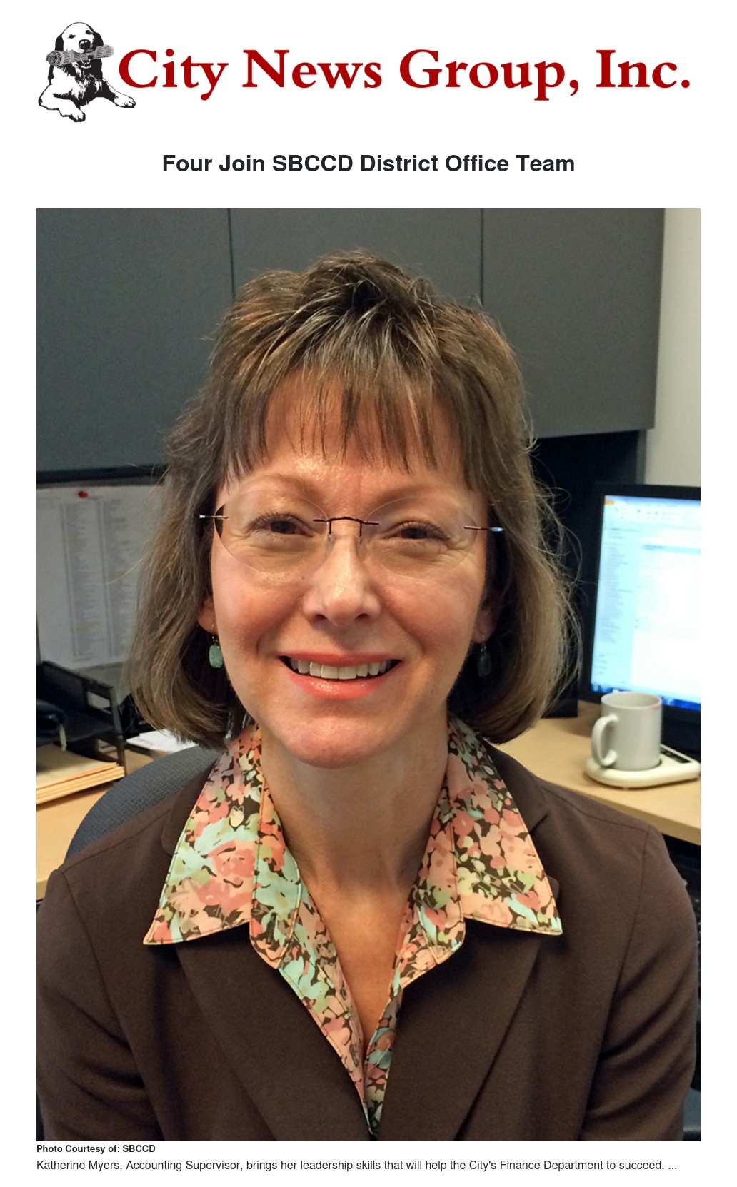 The San Bernardino Community College District (SBCCD) welcomes four new administrators: John Grow as the Director of Facilities Planning and Construction; Greg Allred, Accounting Manager; Katherine Myers, Accounting Supervisor, and Tom Welsh, Cenergistic Energy Specialist.