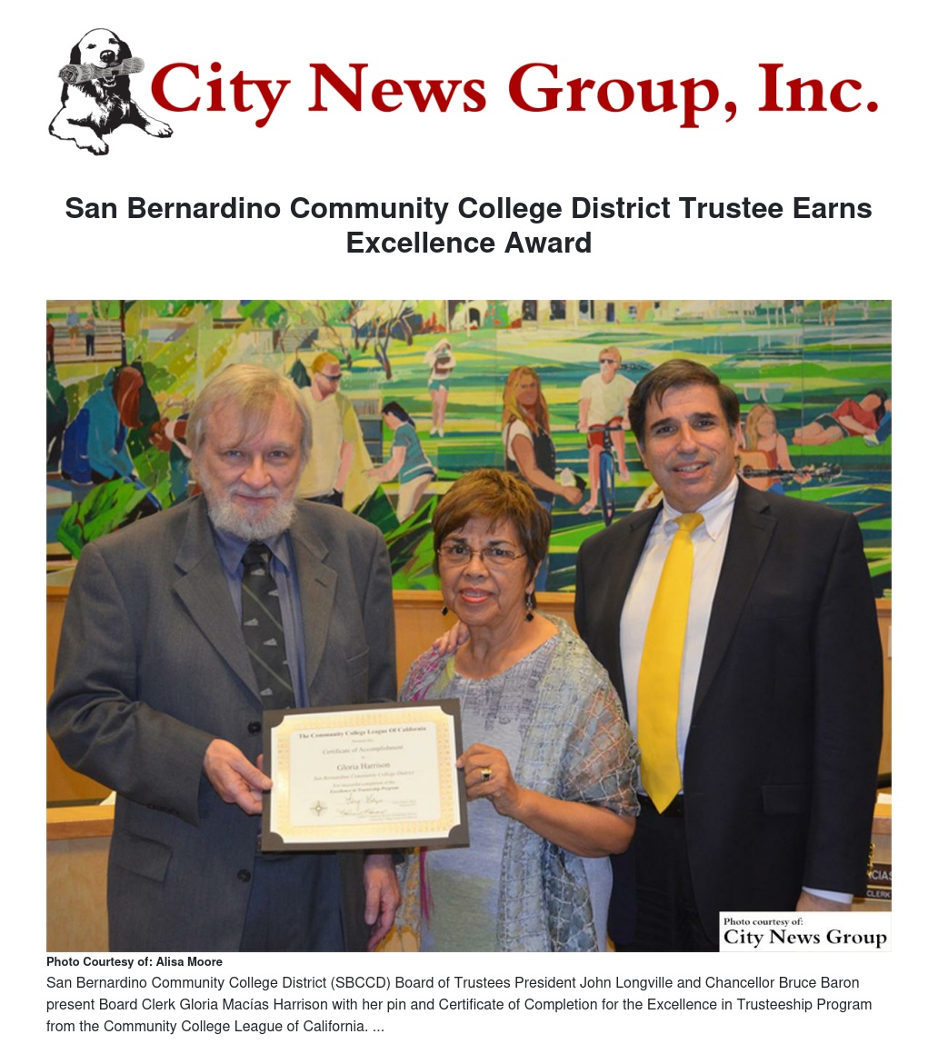 Gloria Macías Harrison, clerk of the San Bernardino Community College District (SBCCD) Board of Trustees, has completed the Excellence in Trusteeship Program offered by the Community College League of California (CCLC). She was presented with the certification of completion at the Board’s regular meeting on Feb. 25.
