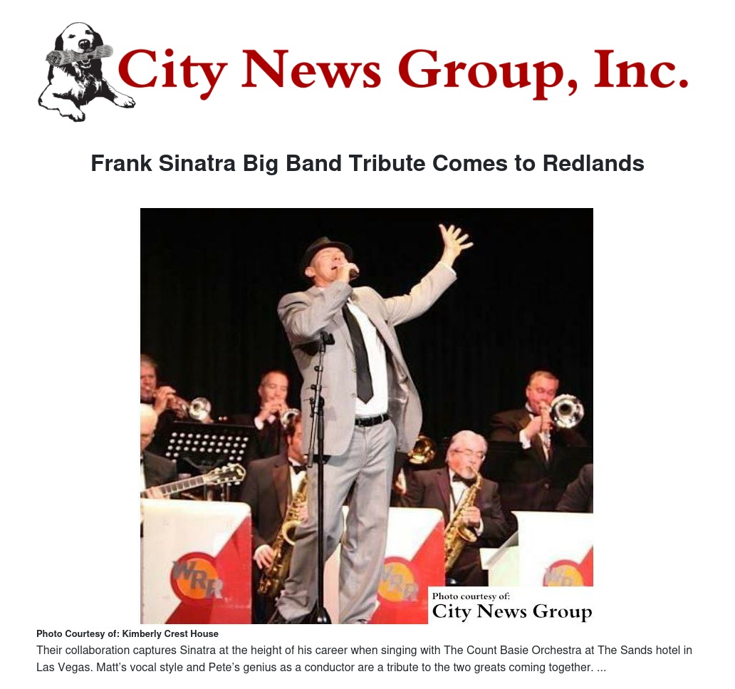 Redlands>>The public is invited to have a swinging good time with Matt Mauser and the Pete Jacobs 12-piece Sinatra Tribute Big Band in the Kimberly Crest gardens on June 17th.