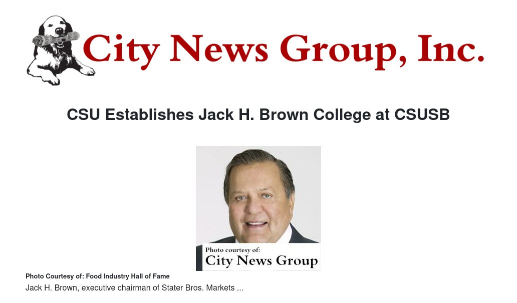 SAN BERNARDINO >> California State University, San Bernardino’s College of Business and Public Administration will be named for businessman and philanthropist Jack H. Brown, executive chairman of Stater Bros. Markets, who last month generously pledged the largest single cash gift in university history to the college.