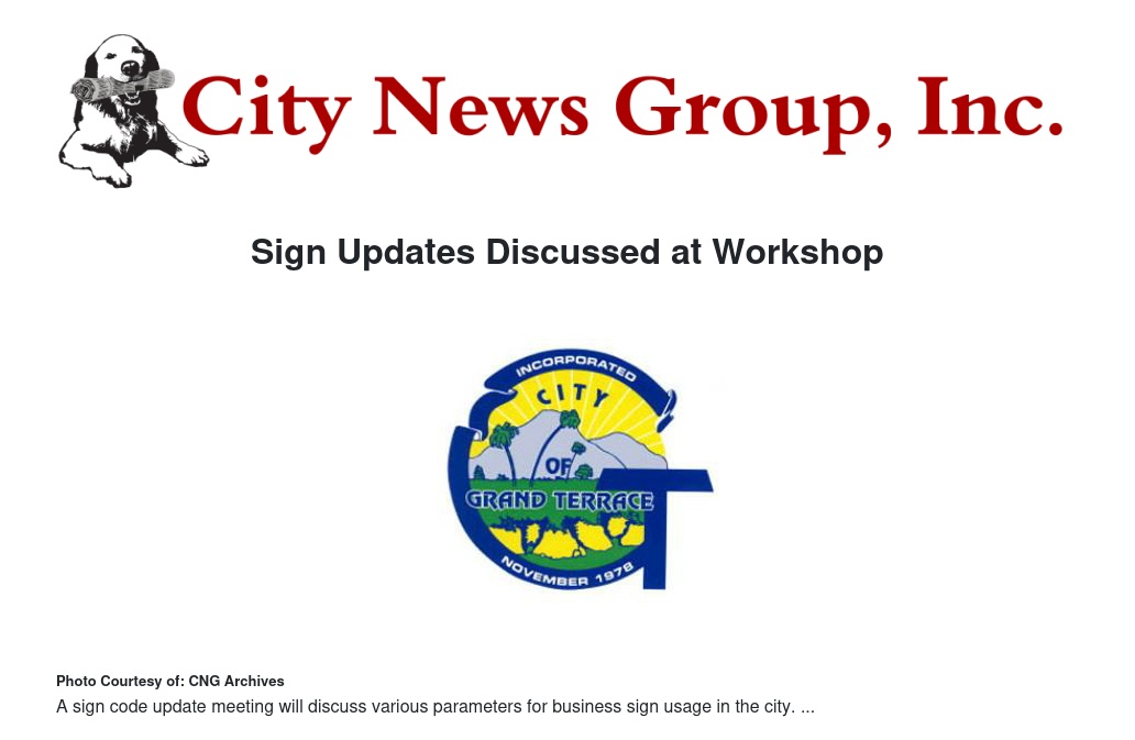 Grand Terrace's Community Development Department is in the process of updating the city's sign code and will hold a public workshop for these updates in the Council Chambers of City Hall on Dec. 18.