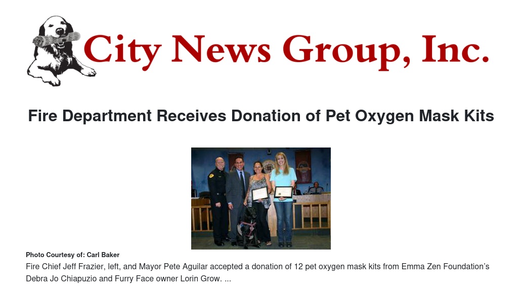 Representatives of the Emma Zen Foundation and Furry Face, A Very Cool Dog & Cat Store donated 12 Pet oxygen mask kits valued at $100 a piece to the Redlands Fire Department during the Redlands City Council meeting Tuesday, Oct. 7.