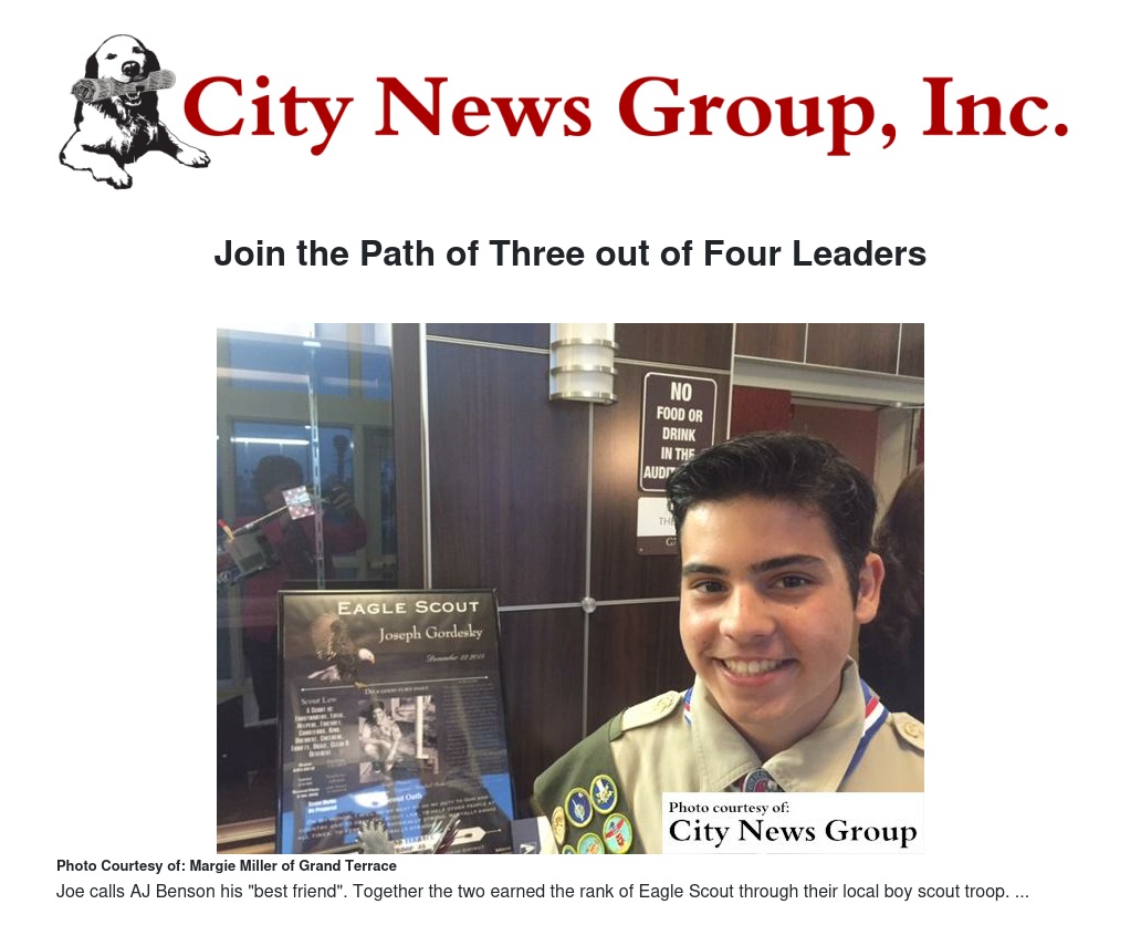 Gordesky, currently a junior at Grand Terrace High School, is the oldest and highest ranking youth member of his troop. Part of his responsibilities include mentoring younger members, speaking at lectures, supervising and working with patrols.