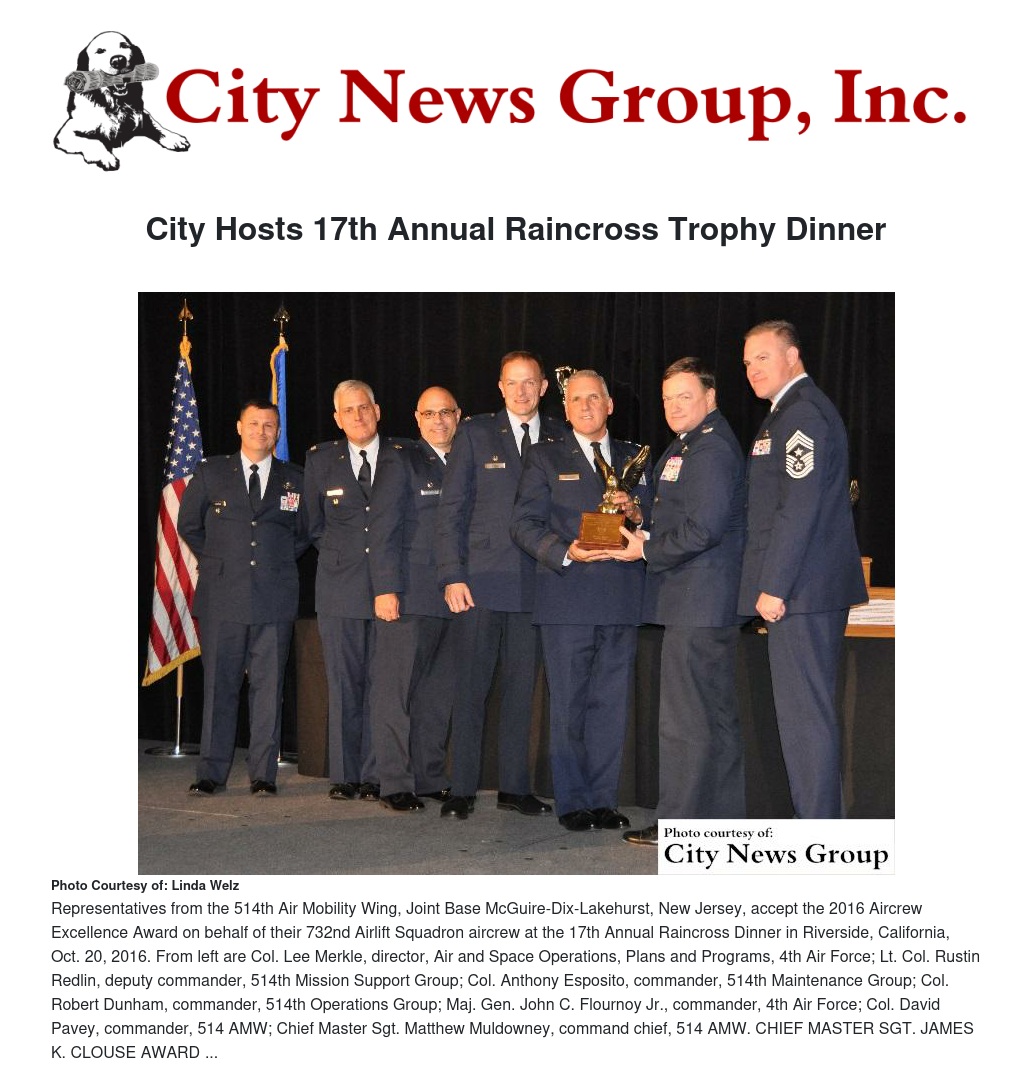MORENO VALLEY>> The 315th Airlift Wing, Joint Base Charleston, South Carolina, was awarded the 2016 Raincross Trophy at a dinner in Riverside Thursday, Oct. 20, naming them best wing in Fourth Air Force, a title they will carry for the next year.