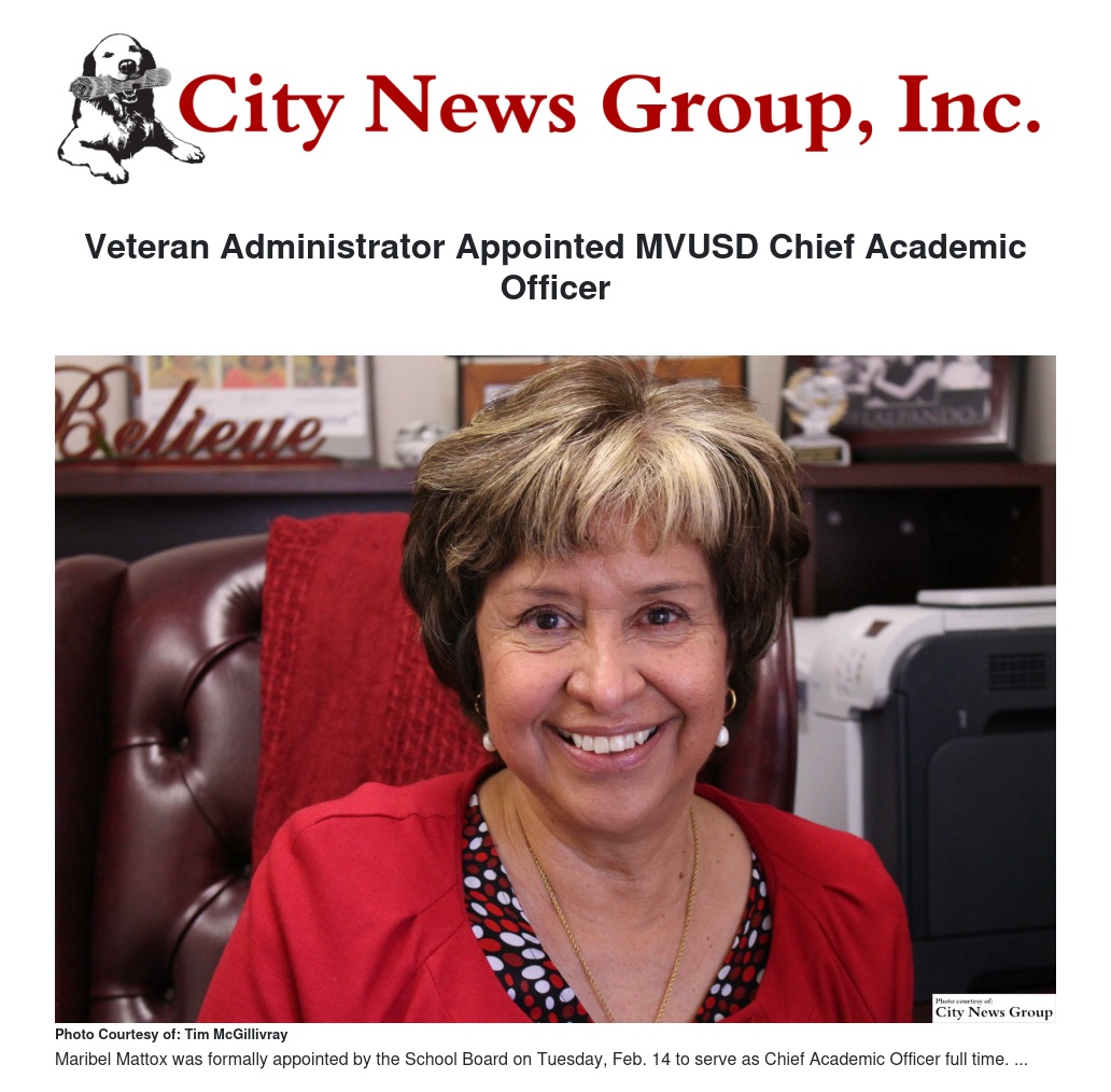 MORENO VALLEY>> A veteran administrator with almost 30 years of experience at Moreno Valley Unified School District, Maribel Mattox was formally appointed by the School Board on Tuesday, Feb. 14 to serve as Chief Academic Officer full time.