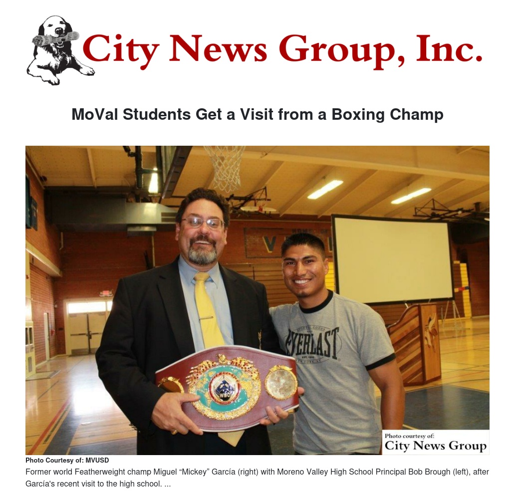 Undefeated Super Featherweight boxing champion Miguel “Mickey” García dropped by Moreno Valley High School recently.