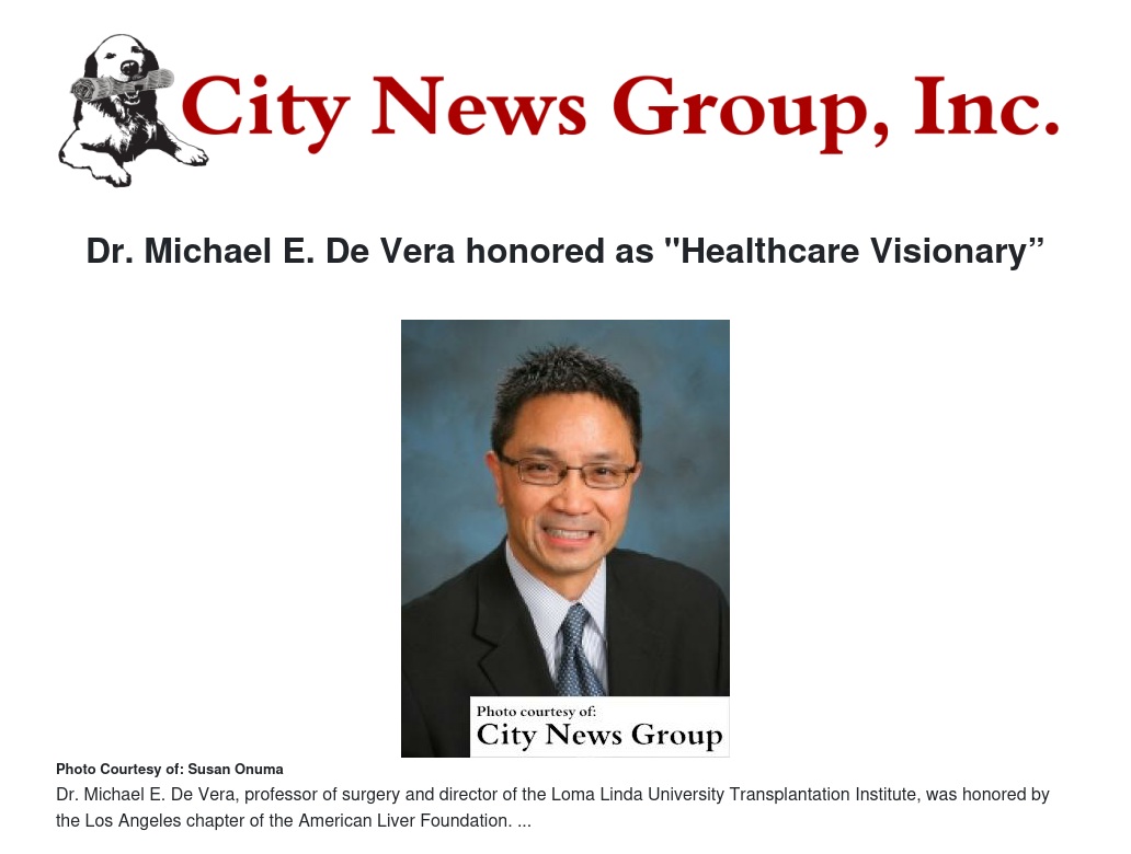 LOMA LINDA>> Dr. Michael E. De Vera, M.D., professor of surgery and director of the Loma Linda University Medical Center Transplantation Institute, was recently honored as a Healthcare Visionary in the field of liver transplantation by the Los Angeles chapter of the American Liver Foundation.