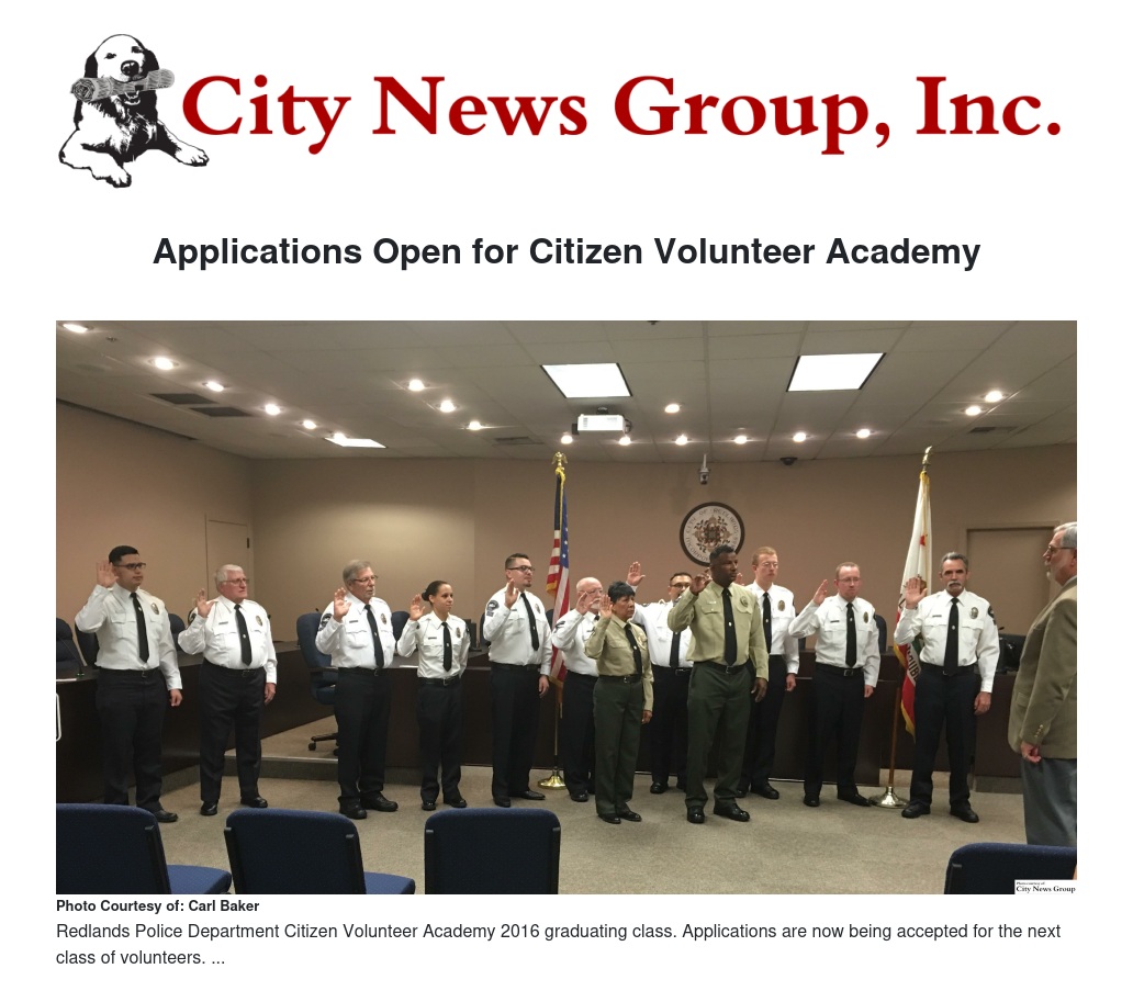 REDLANDS>> Applications are now being accepted for the next Redlands Police Department Citizen Volunteer Academy which will be held March 2 through April 20, 2017. Graduation is scheduled for April 26, 2017.