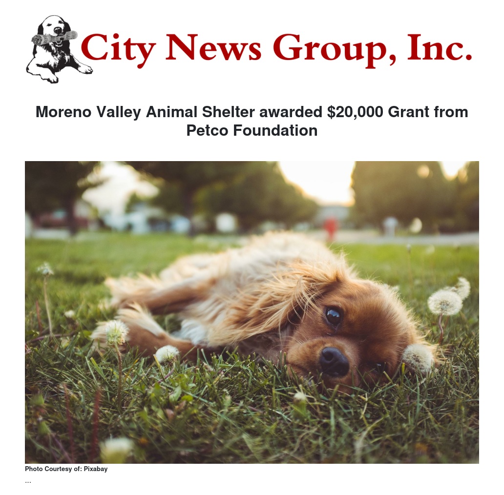 The Moreno Valley Animal Shelter was awarded a $20,000 grant from the Petco Foundation to support the construction of a new dog play yard. Grant funds will be used for the construction of an enrichment play yard area that will benefit homeless canines cared for at the Moreno Valley Animal Shelter.
