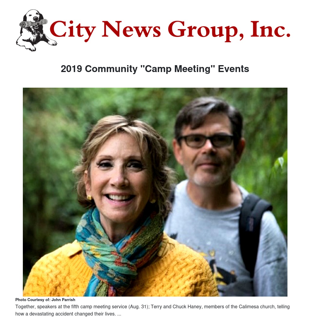 On the final morning of camp meeting, August 31, Terry and Chuck Haenny, Redlands residents and members of the Calimesa church, will tell how a devastating accident last year changed their lives and brought new understanding of their relationships to God and others around them. Their journey will be featured in both morning worship services that day.