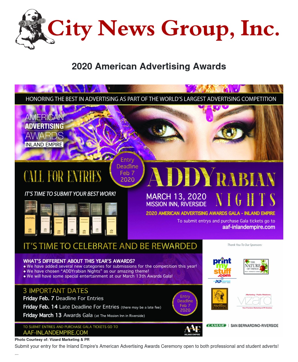 On Saturday, March 13, 2020 the American Advertising Federation Inland Empire chapter will host its annual awards and gala, themed “ADDYrabian Nights” at the Mission Inn in downtown Riverside to honor the best in advertising. Professional and Student entries were being accepted from February 7, 2020 with late entries accepted until February 14, 2020.