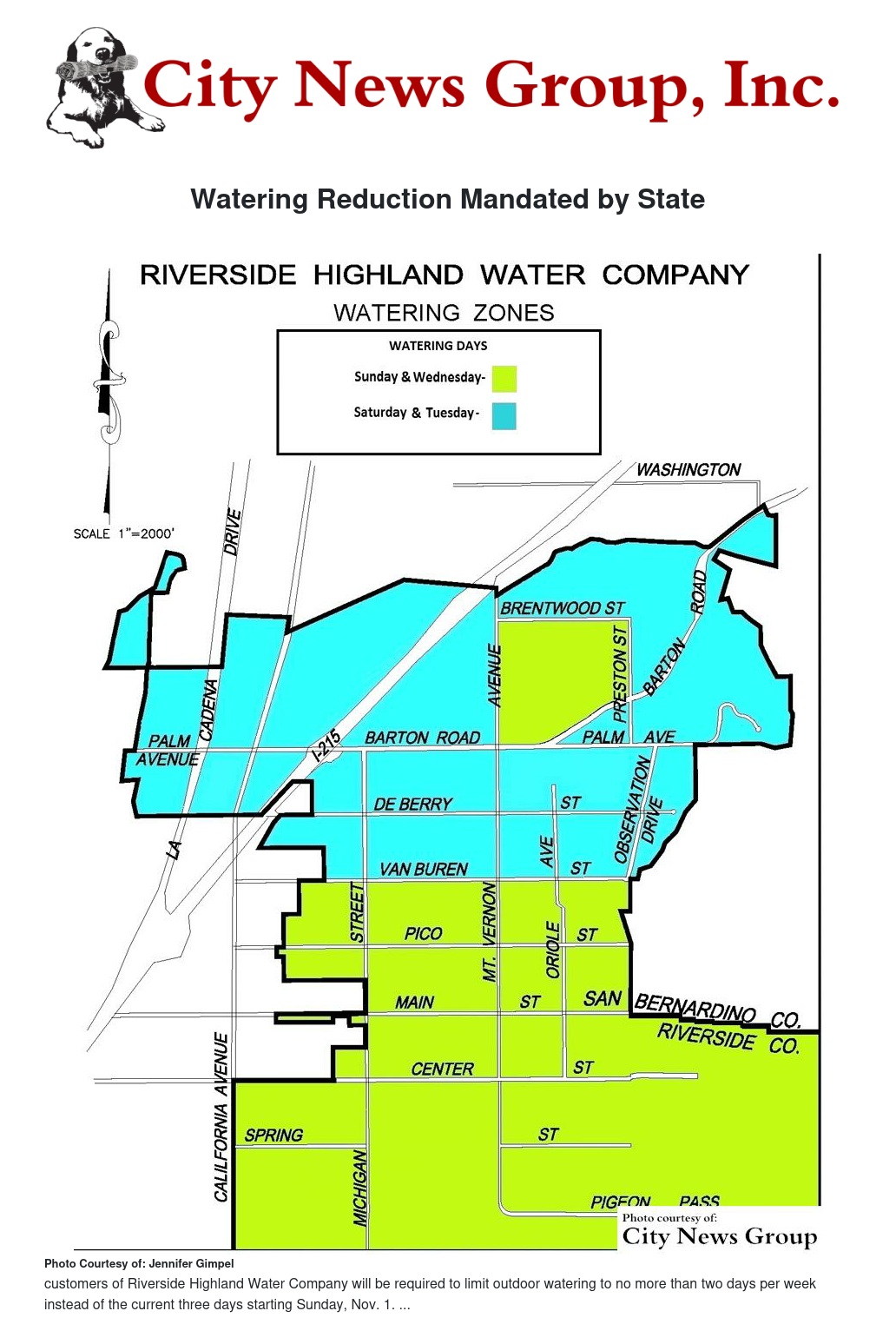 In order to meet state mandated water reduction, customers of Riverside Highland Water Company will be required to limit outdoor watering to no more than two days per week instead of the current three days starting Sunday, Nov. 1.