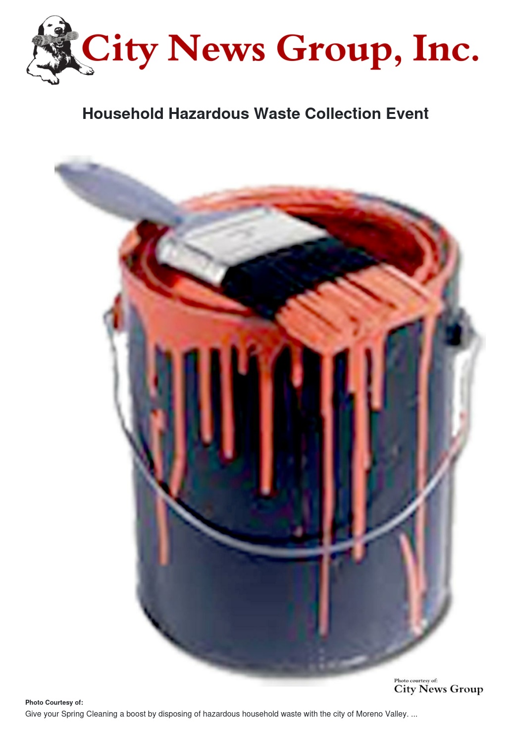 The city of Moreno Valley and Riverside County Waste Management Department will host a Household Hazardous Waste (HHW) collection event on Saturday, April 18 and Sunday, April 19 at the City Corporate Yard located at 15670 Perris Blvd from 9 a.m. - 2 p.m. each day.