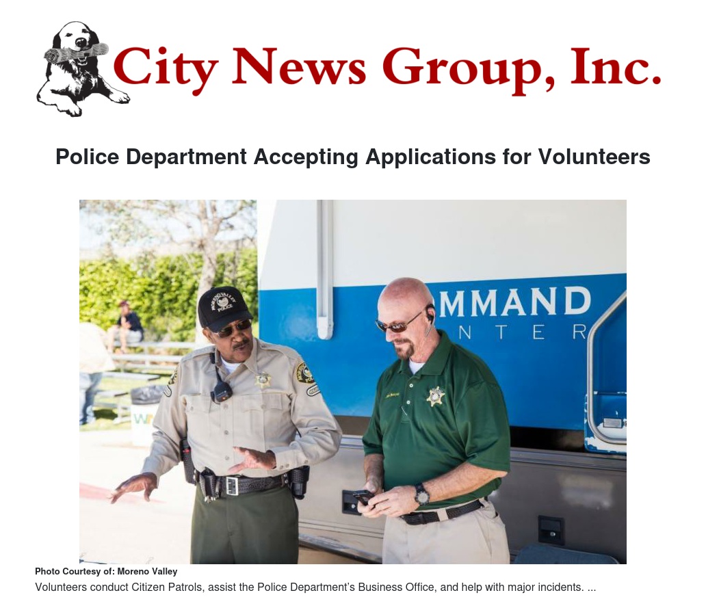 The Moreno Valley Police Department is currently accepting applications for the station’s volunteer program. Volunteers augment the service the Police Department provides residents of Moreno Valley.