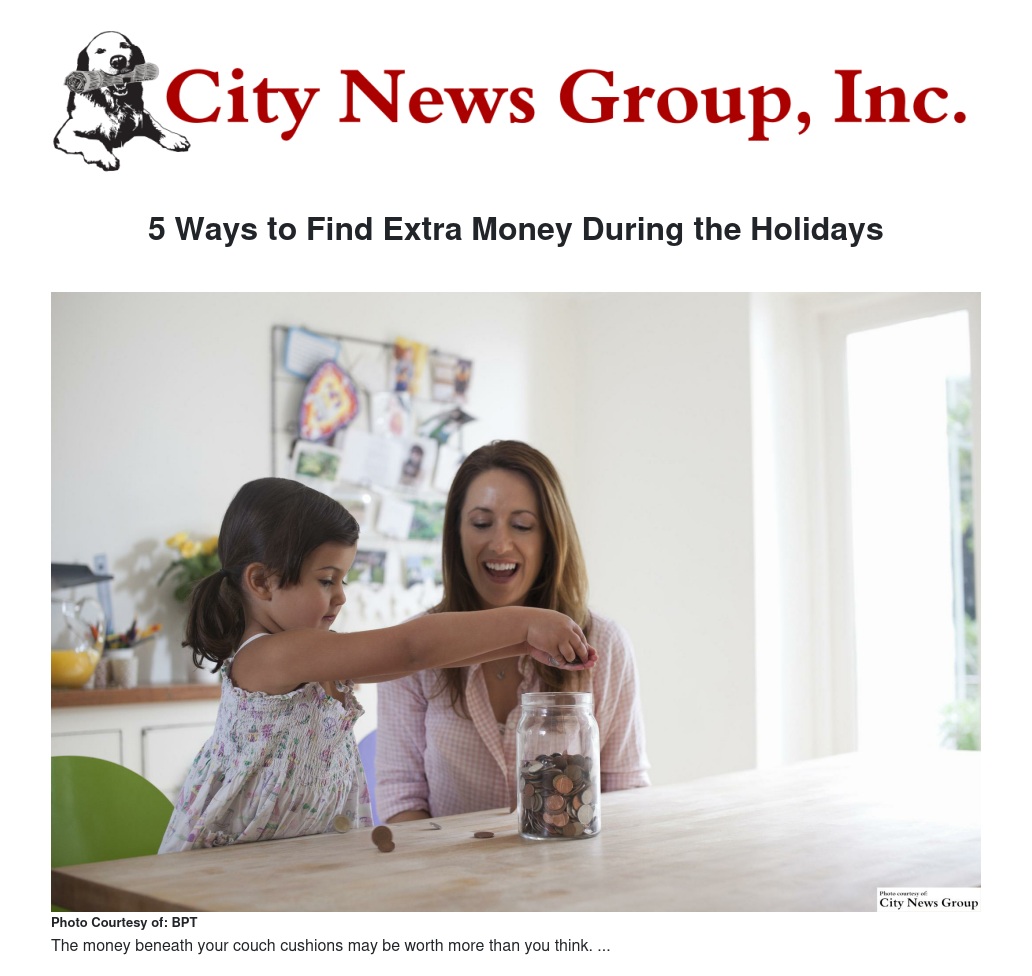 As you're picking up your house and getting ready for guests to come over, take a good look under the couch cushions for spare change, and don't forget all those things you're moving to the basement. Add up that spare change to put toward your holiday budget. And, could you move some of your possessions out the door instead? Craigslist, eBay and Facebook all make selling your old possessions easier than ever. And don't forgo the traditional garage sale - one successful Saturday could give you the money you need to enjoy the holidays without debt concerns.