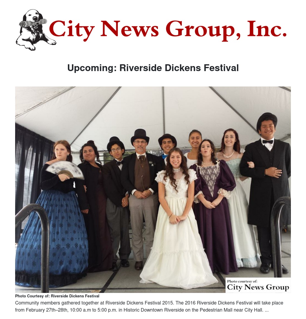 The 2016 Riverside Dickens Festival will take place Feb. 27–28 from 10 a.m to 5 p.m. in Historic Downtown Riverside on the Pedestrian Mall near City Hall.