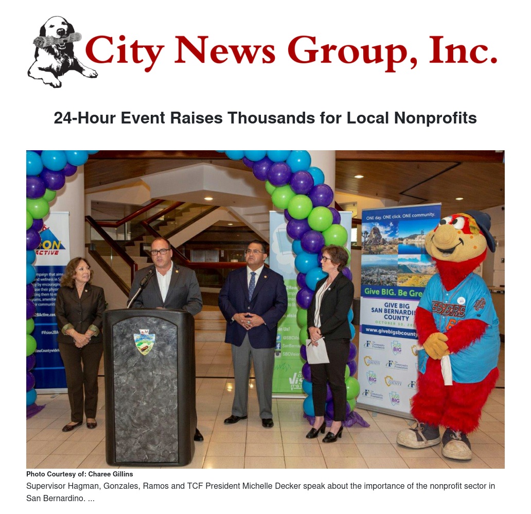 “Donors throughout San Bernardino County proved once again they have big hearts for Give BIG and we thank them for supporting our local nonprofits and charities,” said San Bernardino County Board of Supervisors Chairman Robert Lovingood. “We’re also proud of the nonprofits for embracing training opportunities and learning new skills in the buildup to this campaign, which has helped them expand their donor base and raise more money to improve their services throughout the county.”
