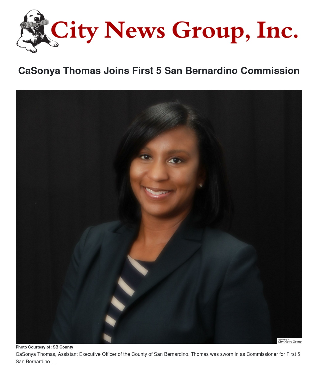 “With our change of focus toward enhancing systems of service to children and families, Commissioner CaSonya Thomas’ knowledge and input can lend greatly to how we broaden our impact on children’s development in the county,” said Karen E. Scott, Executive Director of First 5 San Bernardino.