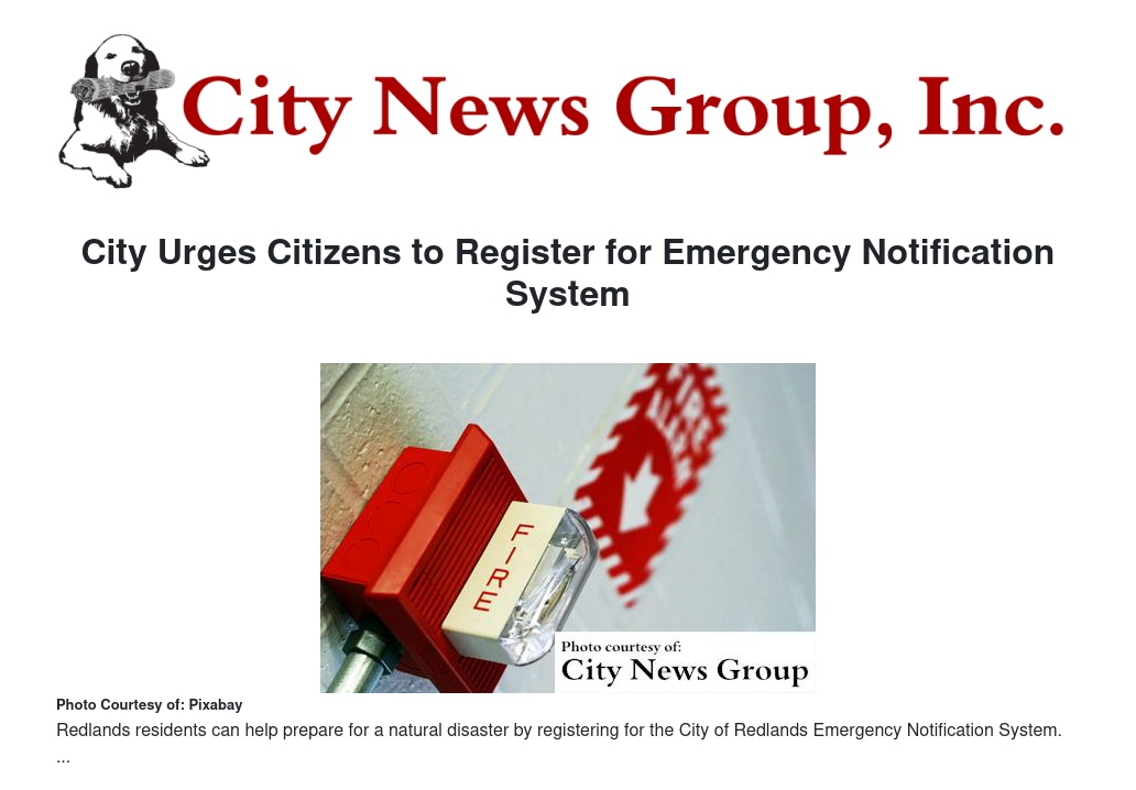 Redlands residents can take action by registering for the City of Redlands Emergency Notification System. The system was implemented in order to communicate emergency and other urgent messages to residents and other community members, using both text and voice messages in the event of an emergency affecting Redlands.