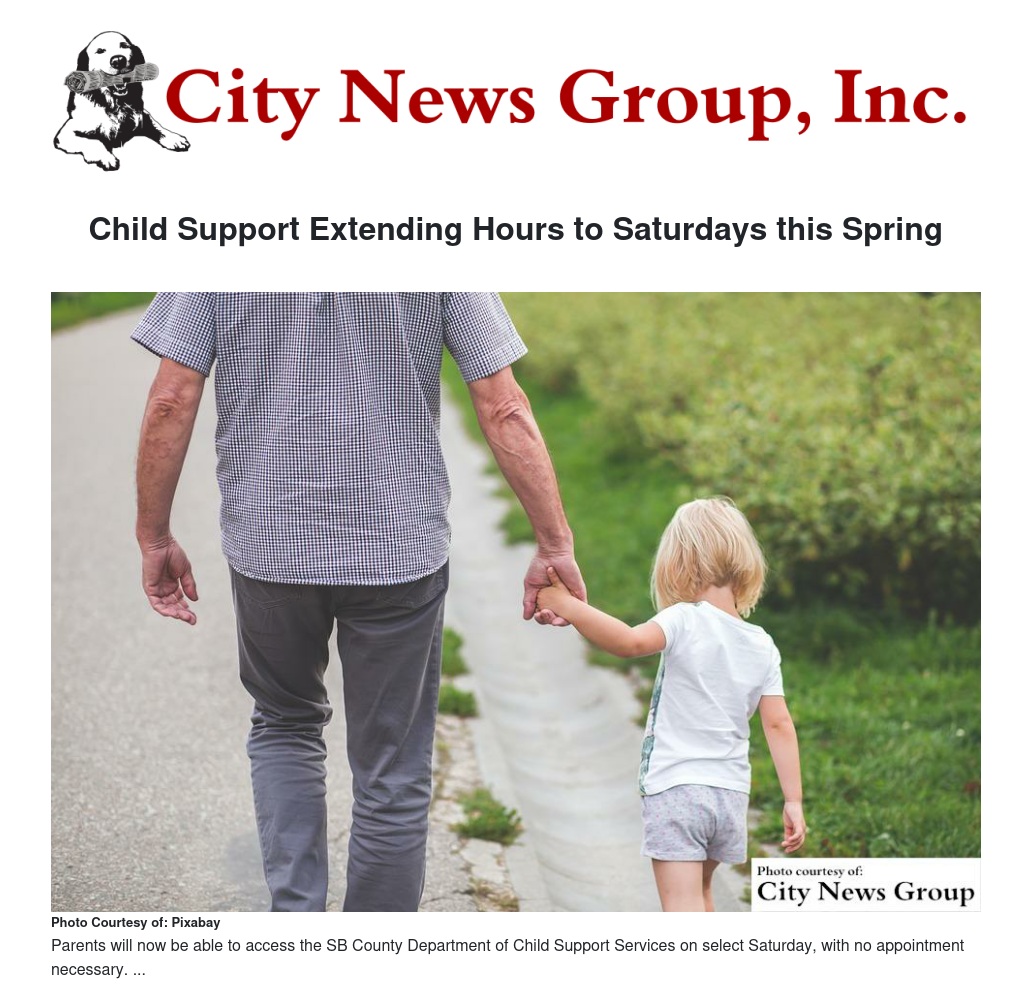 SAN BERNARDINO>> For the convenience of parents, the San Bernardino County Department of Child Support Services (DCSS) will be open on Saturday, April 22, Saturday, May 20, and Saturday, June 3 from 8 a.m. to 1 p.m. at the Loma Linda and Victorville offices. No appointments are necessary and all walk-in customers are welcome. Child support professionals will be ready to help customers in taking steps to successfully manage their child support cases.