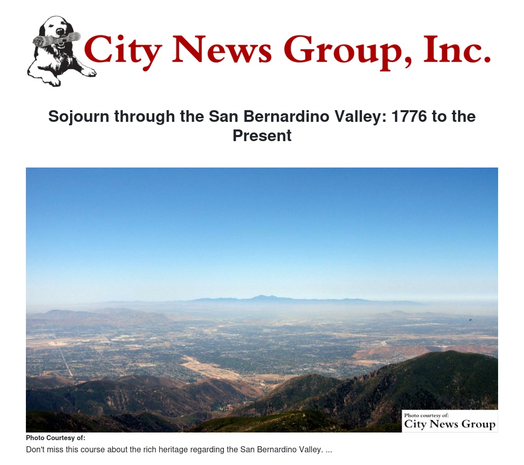 On Saturday, May 7, Nick Cataldo will be teaching the course “Sojourn Through The San Bernardino Valley: 1776 To The Present”, offered through Cal State San Bernardino's Office of Extended Education.