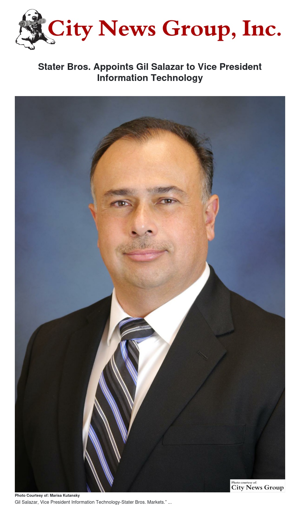SAN BERNARDINO >> Pete Van Helden, President and Chief Executive Officer of Stater Bros. Markets, is proud to announce the appointment of Gil Salazar to the position of Vice President Information Technology (IT) for Stater Bros. Markets.