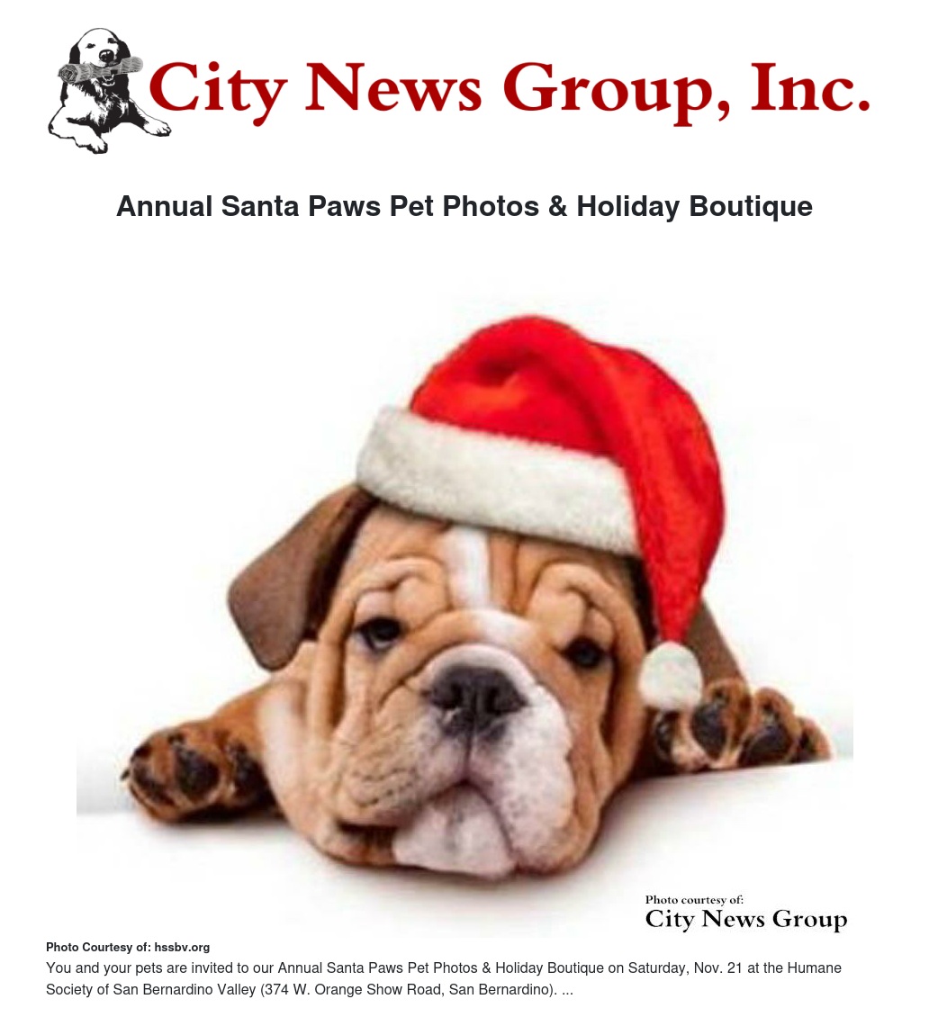 You and your pets are invited to our Annual Santa Paws Pet Photos & Holiday Boutique on Saturday, Nov. 21 at the Humane Society of San Bernardino Valley (374 W. Orange Show Road, San Bernardino).