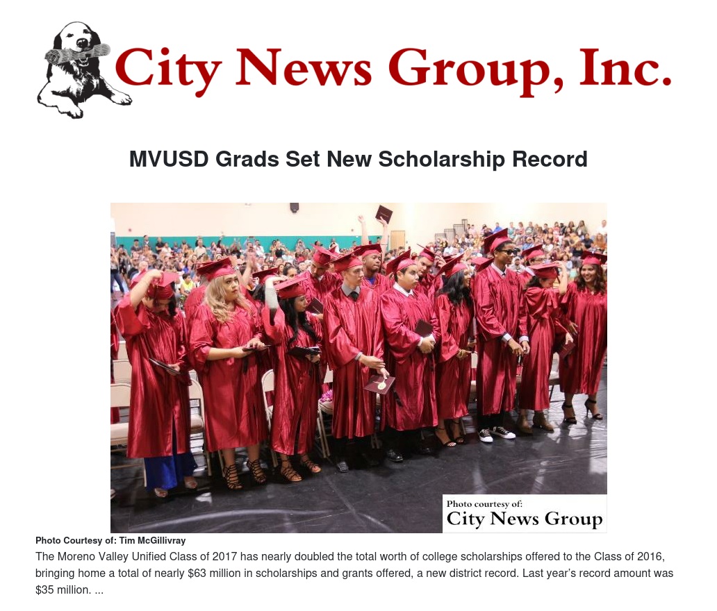 MORENO VALLEY>> The Moreno Valley Unified Class of 2017 has nearly doubled the total worth of college scholarships offered to the Class of 2016, bringing home a total of nearly $63 million in scholarships and grants offered, a new district record. Last year’s record amount was $35 million.