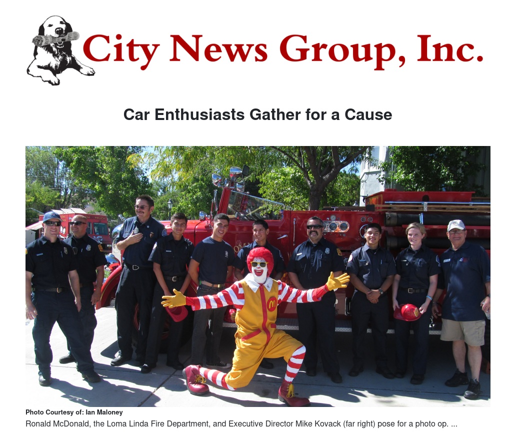 The Loma Linda Car Show was also attended by the Loma Linda Fire Department and even Ronald McDonald, spokesperson for McDonalds, stopped by to entertain the guests and pose for pictures for eager fans.