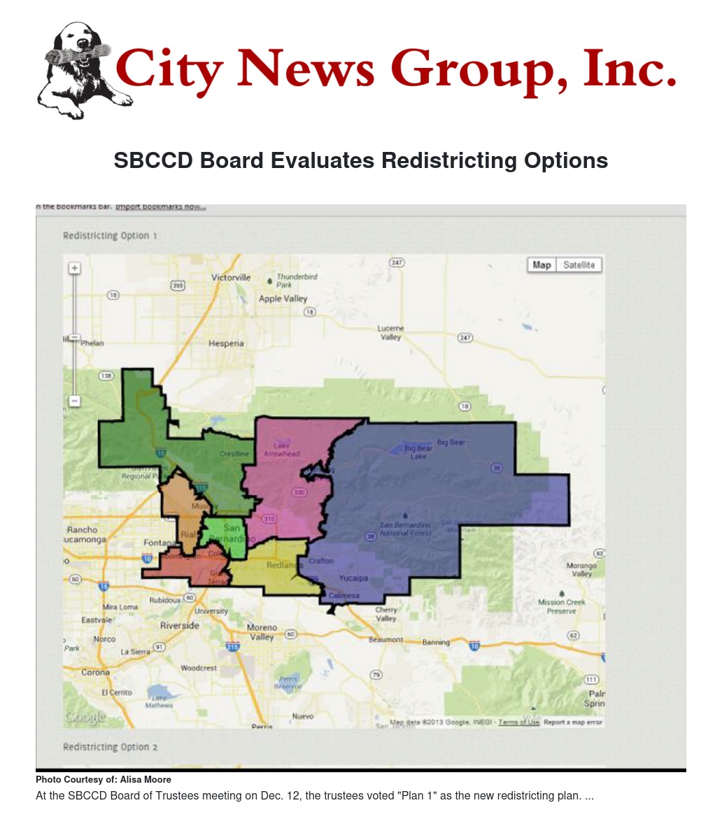 After public hearings and presentations from various stakeholders, the trustees on the San Bernardino Community College District (SBCCD) seven-member board selected “Plan 1” from three options that were created by a bipartisan firm from Sacramento, Redistricting Partners, who have provided similar services for numerous other local governments and college and school districts throughout the state. The vote took place at the SBCCD Board of Trustees regularly scheduled board meeting on Dec. 12 and was an agenized item.